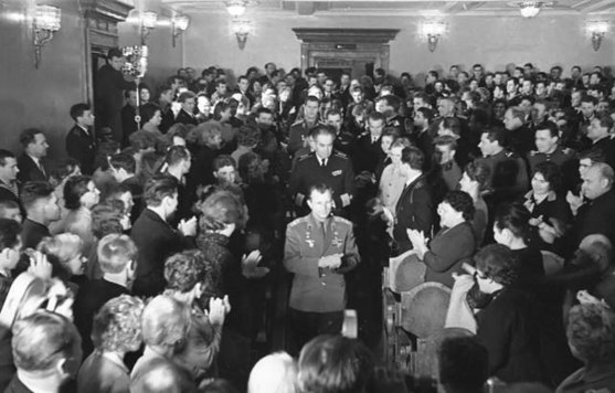Первый космонавт Юрий Гагарин выступает перед северянами в Доме офицеров. Фото: Минкультуры Мурманской области