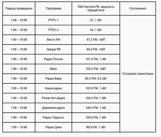 Планируется, что отключение вещания затронет эфирную трансляцию 1-го и 2-го мультиплексов в цифровом формате и радиоканалов в аналоговом формате.