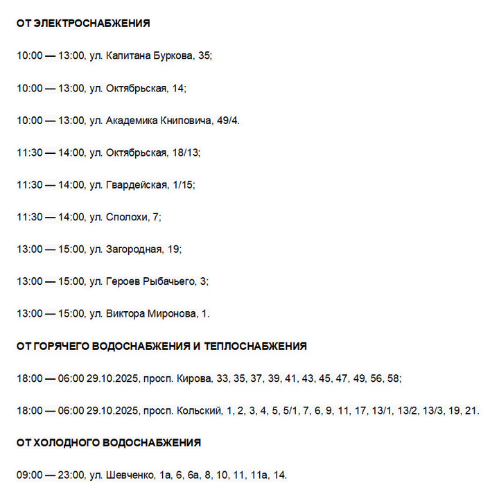 В Мурманске 28 октября отключат электричество, отопление, холодную и горячую воду.